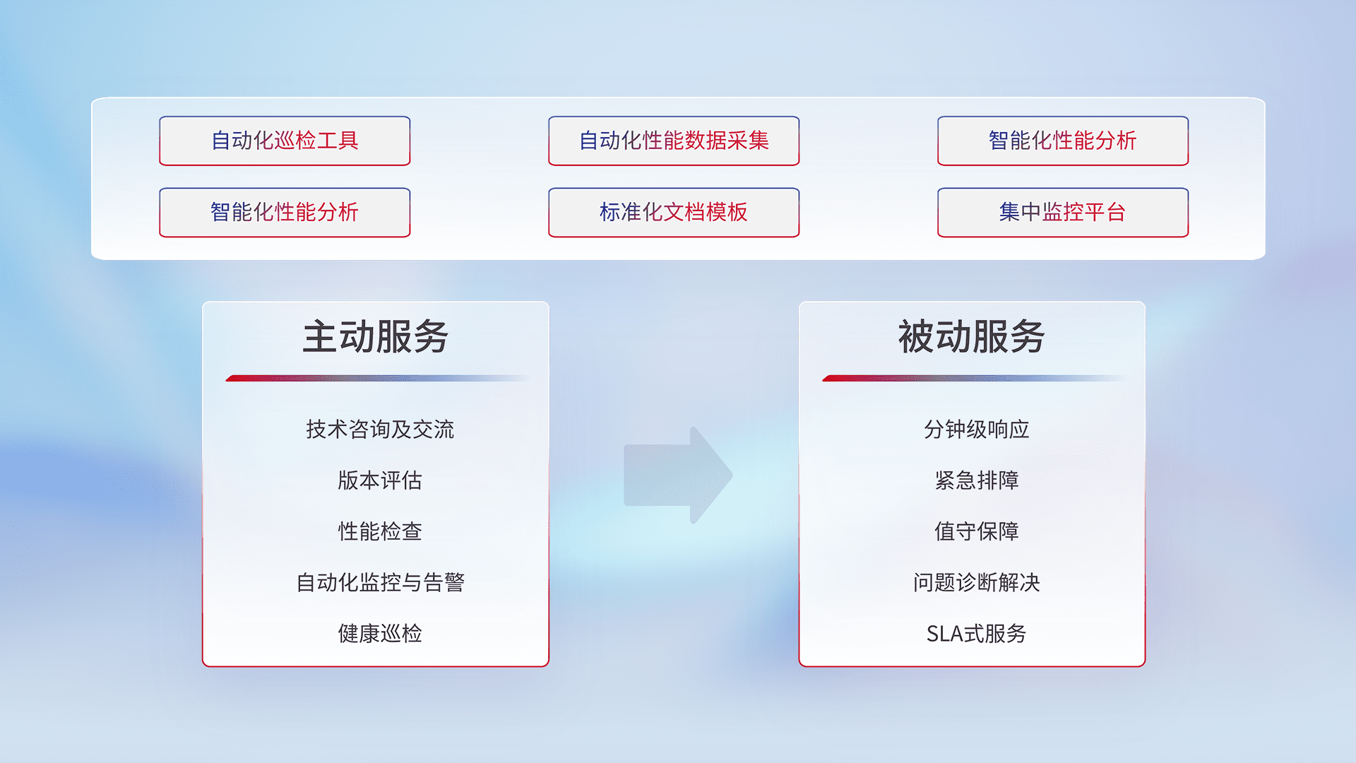智能化工具和标准化文档,,保障服务质量,,提供主动服务(包含技术咨询、、、版本评估、、性能检查、、自动化监控与告警、、、健康巡检)和被动服务包含(分钟级响应、、、、紧急排障、、、、值守保障、、、、问题诊断解决、、、SLA服务)。。。